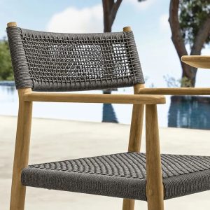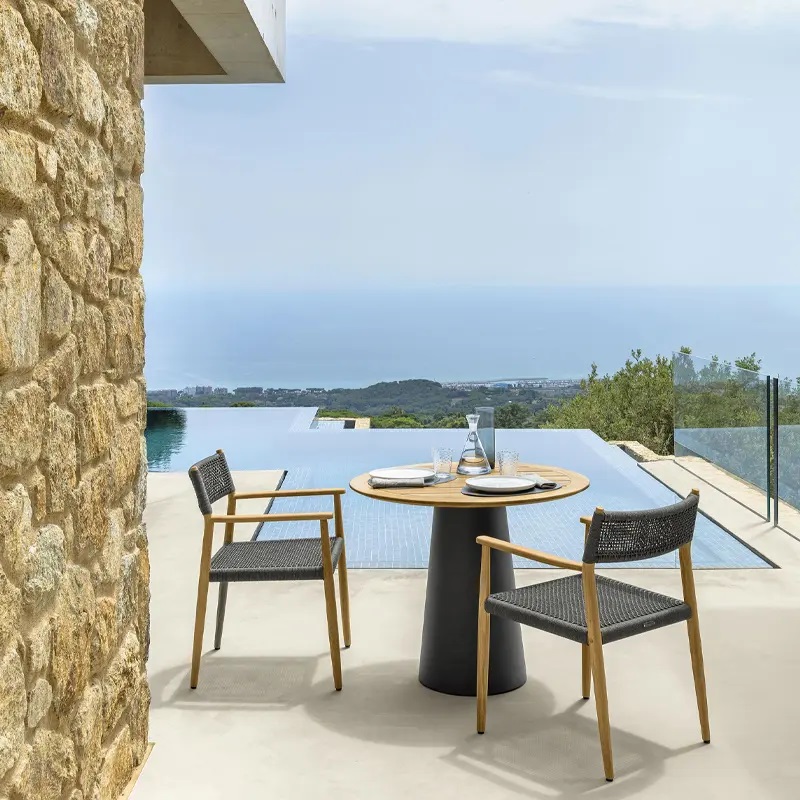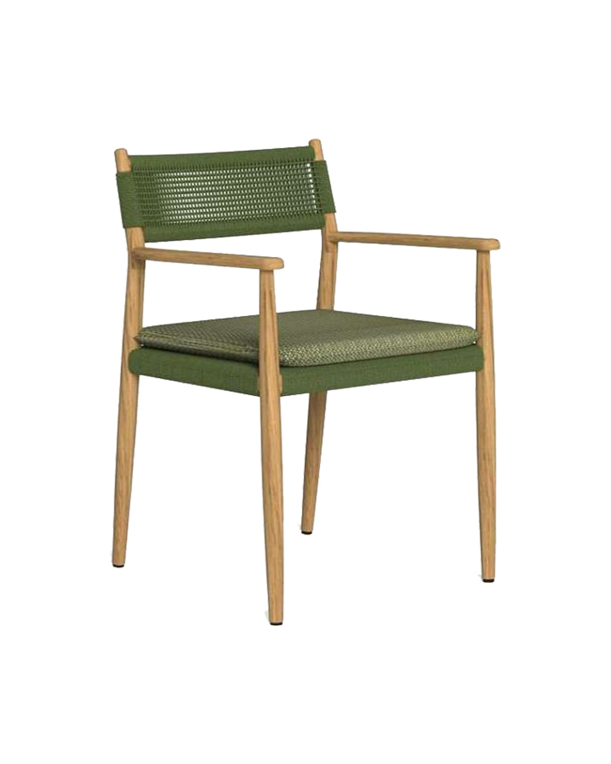 The Aldo dining armchair is the perfect solution for enhancing your garden living area, adding style and lightness. The wooden frame has a simple, linear composition that highlights the natural beauty of the teak and the refined finishes of every detail.