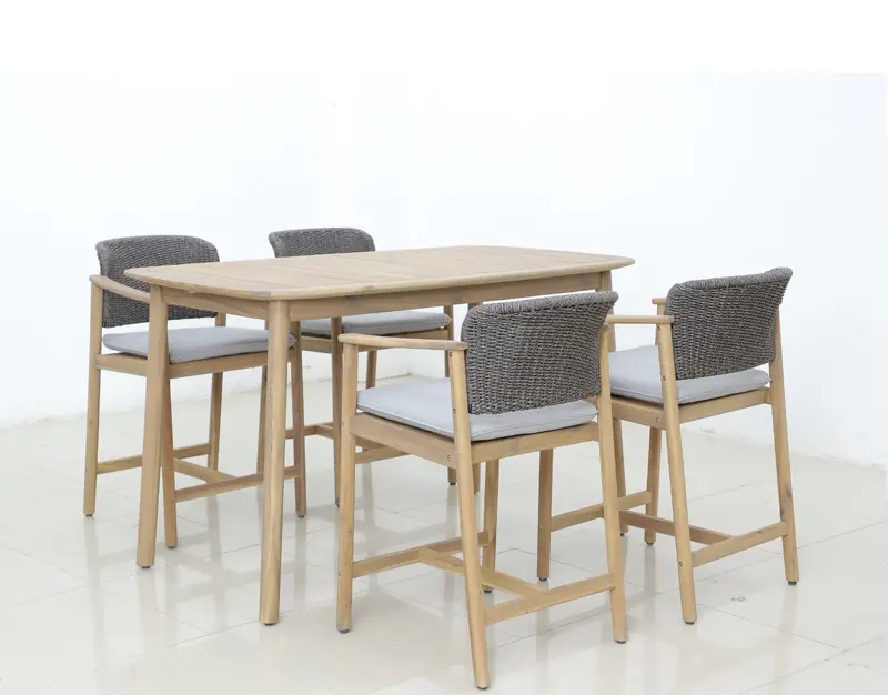 This bar stool is made from solid acacia wood, showcasing its natural grain and sturdy design. It features a comfortable grey cushion, adding a modern touch and extra comfort, making it a stylish addition to any bar or kitchen space.r is the perfect solution for enhancing your living area in the garden. The solid teak wood structure embraces the large and comfortable seat. made of wood, padded seat with fabric covering, available in different finishes.